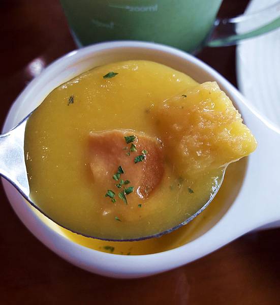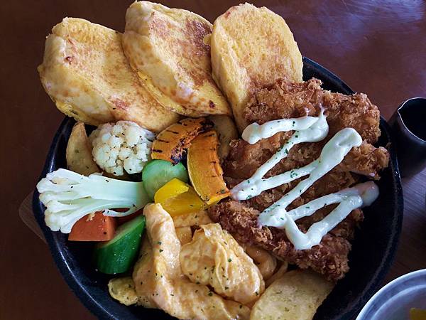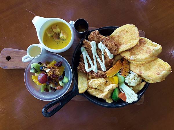 一旁搭配炸馬鈴薯條、南瓜片、水煮蔬果、嫩蛋