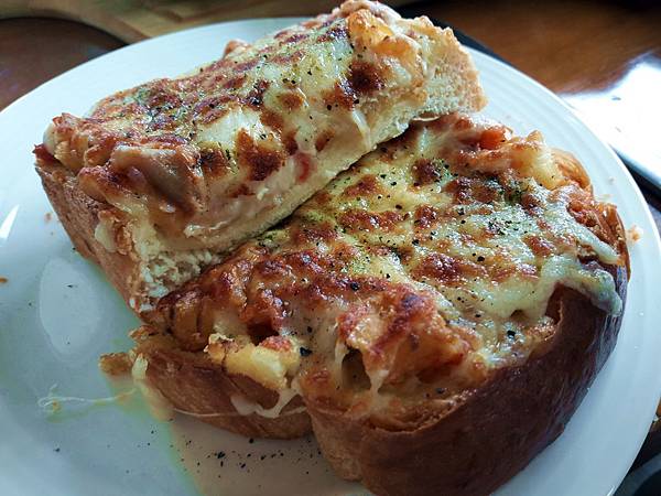 麵包底是帕瑪森麵包切片沾蛋液煎至兩面金黃