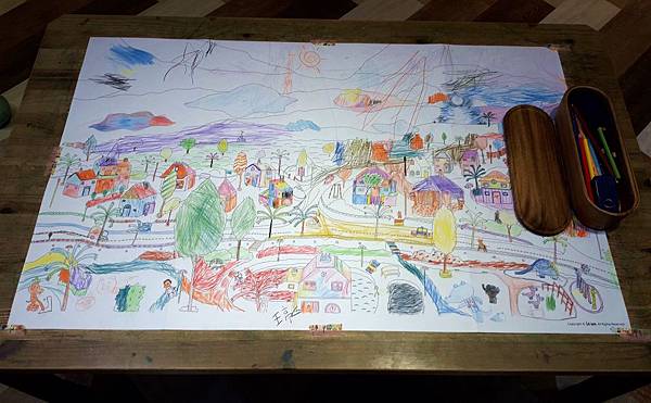 桌上有一張快跟桌子一樣大的圖畫紙,上頭有鄉村圖案