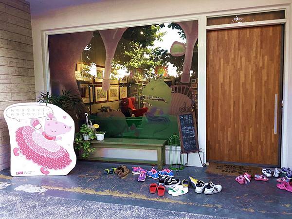 進到繪本館裡要拖鞋,也不能帶任何食物進去唷