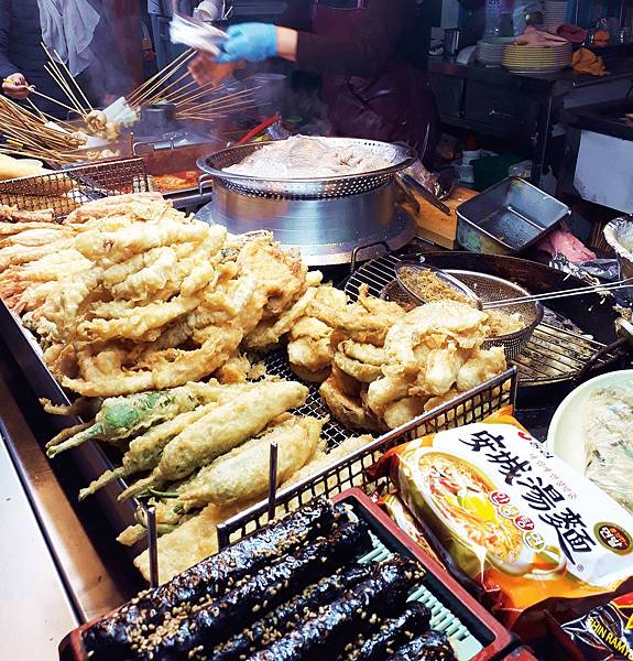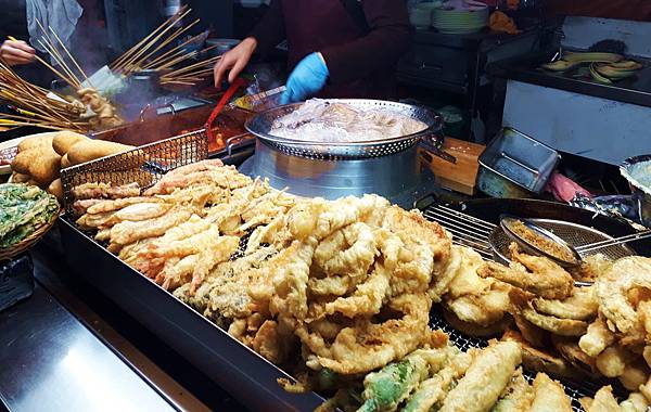 攤位上有許多炸物可挑選